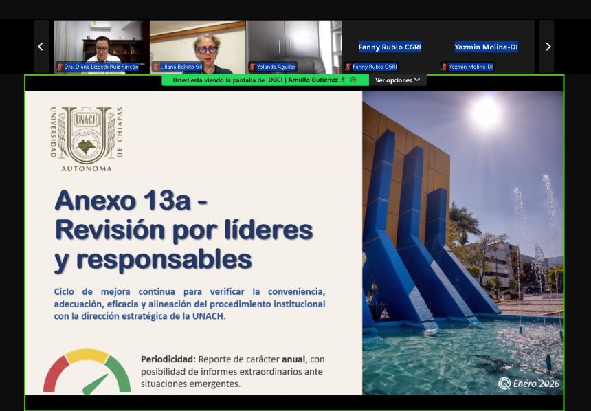Se llevó a cabo una reunión con líderes, responsables y enlaces de calidad de las áreas institucionales, con el objetivo de presentar y orientar el llenado del Anexo 13A: Revisión por líderes y responsables, instrumento clave del Sistema de Gestión Integrado de la Universidad Autónoma de Chiapas.